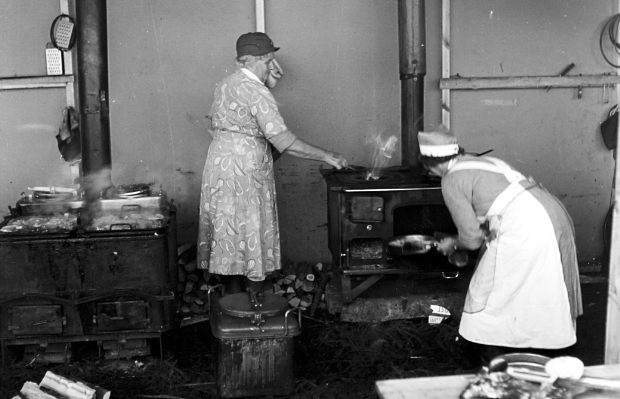 F6 Karlsborg 1952. Eskaderövning i Hultsfred. Förplägnadsinrättningen. Albumet är en del av en donation från Karl-Axel Hansson, Karlsborg. Förteckning över hela donationen finns i albumet samt som Word-dokument.