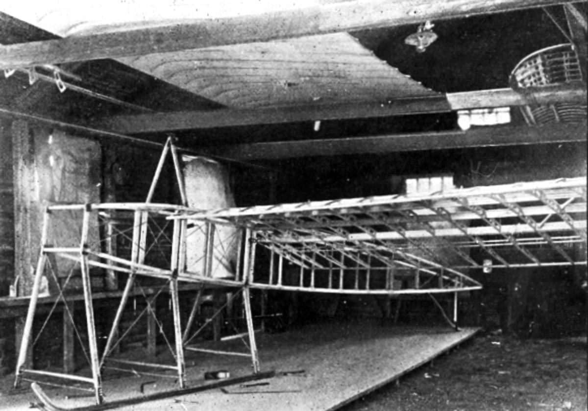 Svensk flyghistoria 1910-1918. Asks flygverkstad i Landskrona. Kroppsskelettet till krigsmonoplanet och förstärkt landställ till tre benpar.