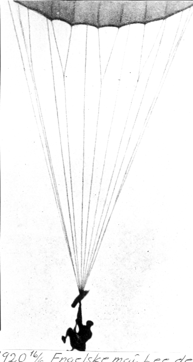 1920. Engelske majoren Lee demonstrerar sin fallskärm "Guardian Angel" på Ladugårdsgärde.