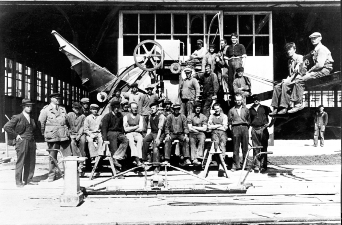 Karlsborg 1938. Hangarbygget nästan klart. Arbetslaget med arbetsledare till vänster.