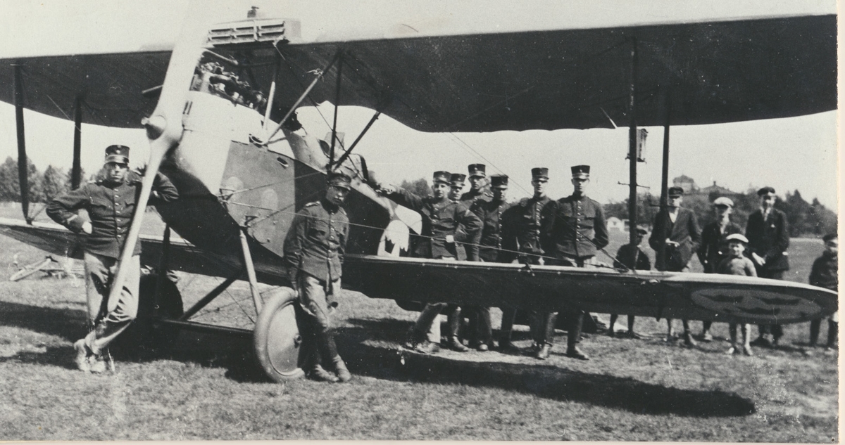 Flyget i Karlsborg före F6. Nödlandad Phönix (J1) på Heden "Lusharpan" pga bränslebrist 1928. Förare löjtnant Sjöby. All landning och start med flygplan från exercisheden förbjöds senare av platsbefälhavaren överste Ekelöf.