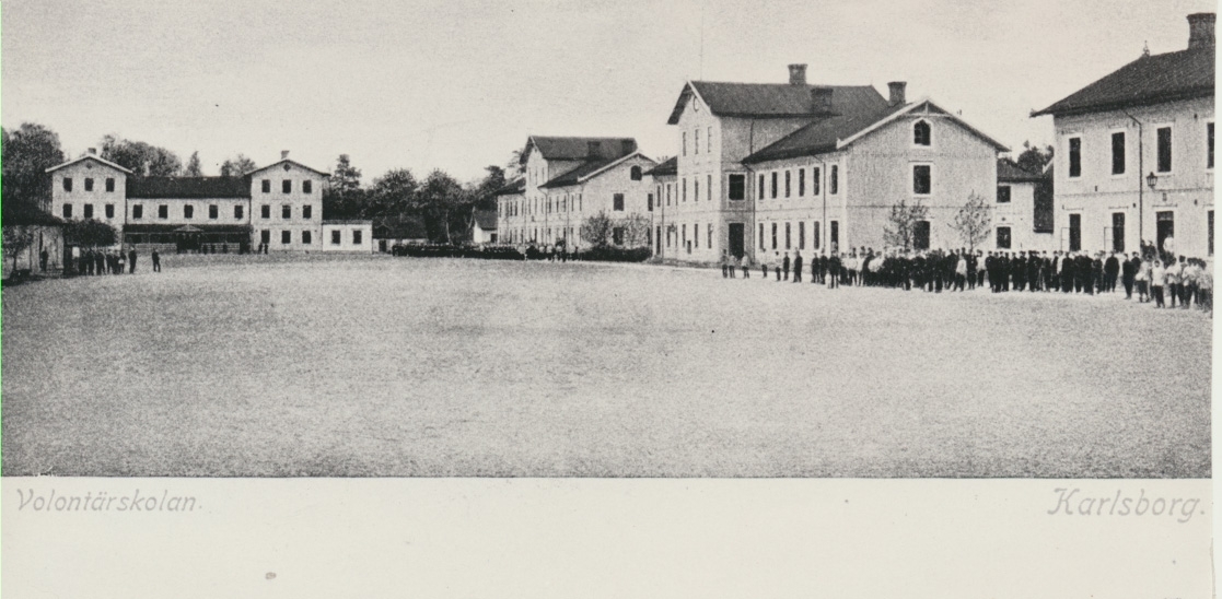 Karlsborg. Infanterivolontärskolan , senare rekrytskolan för infanteriets officers-och reservofficersaspiranter.Befälsbyggnaden rakt fram, fick förlängning på husets gavlar 1887. den ena syns på husets högra sida.