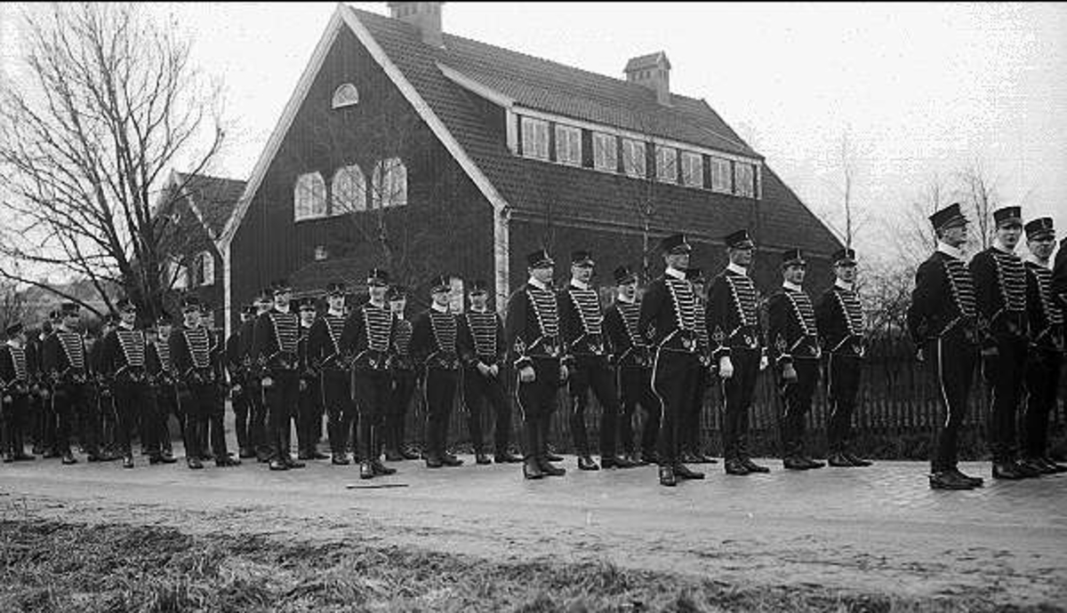 2.skvadron före avmarsch från soldathemmet till kasern efter högtidlighållandet av 4 december i främre ledet från vänster: Furir Gustavsson, furir Karlsson, furir Dahl och furir Landgren.
