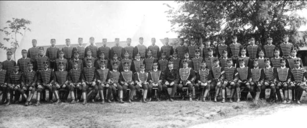 I första raden: Ryttmästare Carl Lewenhaupt, till höger om honom löjtnant Zegerbaden och regementsveterinär Zreibergh och korpral Svensson. Till vänster om ryttmästare löjtnant Klingspore, serg Eklund, och Östlund, längst till höger volontär Evardsson och serg Nyström.