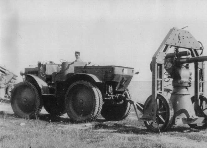 Till vår första egentliga luftvärnskanon m/17 användes en särskild transportkärra, som drogs av den "midjestyrda" traktorn m/28.