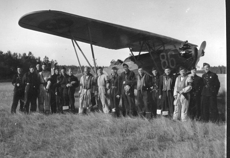 F6 Karlsborg 1944. 3. divisionens flygande personal sådan den deltog i flygvapenövningarna den 8/9-16/9. Bilden tagen på fält 9, Stigtomta som var divisionens ordinarie bas. Namnlista finns i albumet, samt som World-dokument. Albumet är en del av en donation från Karl-Axel Hansson, Karlsborg. Förteckning över hela donationen finns i albumet samt som Word-dokument.