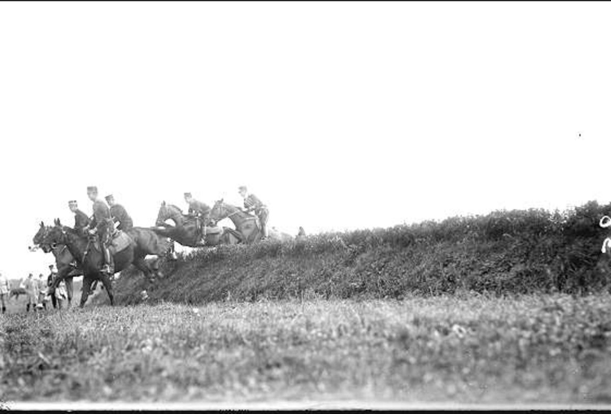Regementskapplöpningar på fältet söder K 3 kasern. Jaktlopp för aspiranter med löjtnant Harald Strömfelt som master. Hoppning över jordvallen öster I 9 (P4) kasernvakt.