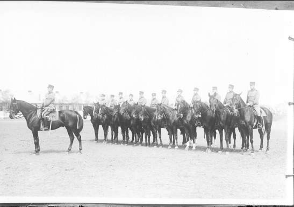 Uppställning på kaserngården söder stallarna. Avlämning före ett "ridpass" antagligen en av stamskolorna.