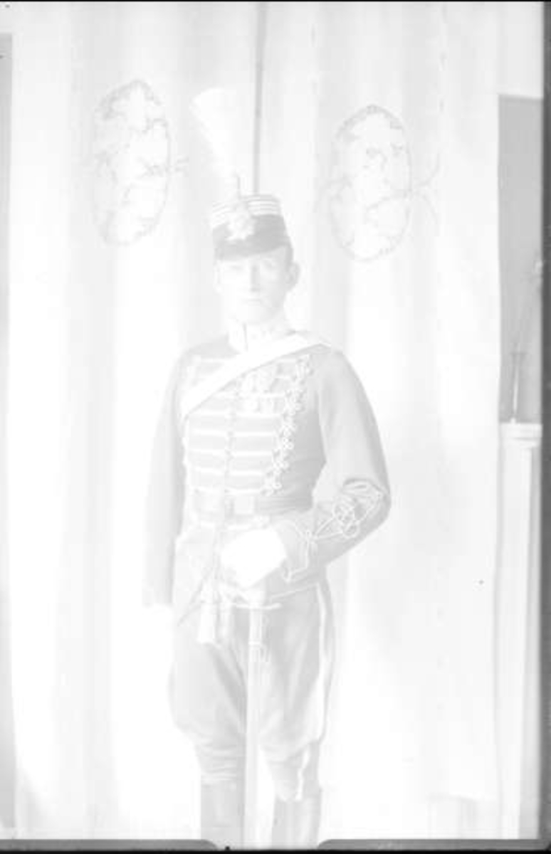 Livhusarofficer i uniform m/ä, stor paradmössa m/1853 med plym, knutskärp m/1778, kartuschrem och kartuschlåda på ryggen, officerssabel m/1893