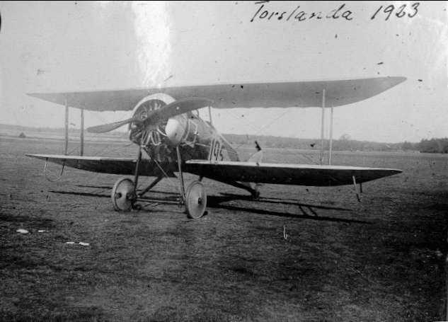 Torslanda år 1923. Flygplan "Tummelisa" som deltog i Ankomsttävlingen 4 augusti 1923 i samband med invigningen av Torslanda flyghamn samma år. Flygförare var Eric Kjellgren.