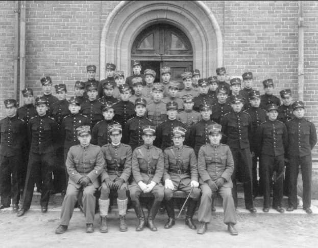 Volontärskolan A 9 Karlsborg 2:a tropp, 1939. I mitten batterichefen kapten Mark, till vänster löjtn Lavqvist, troppchef, längst till höger batteriadjutanten styckjunkare Thunheden. Kortet finns ej på museet, utan tillhör Allan Mikaelsson, Tranås.