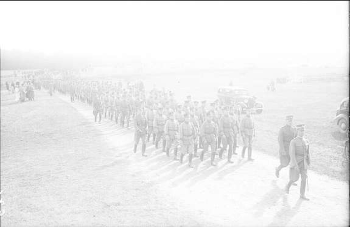 På marsch från kasern till fältgudstjänst i Dunkehall. Soldaterna iklädda uniform m/1910 och mössa m/ä.