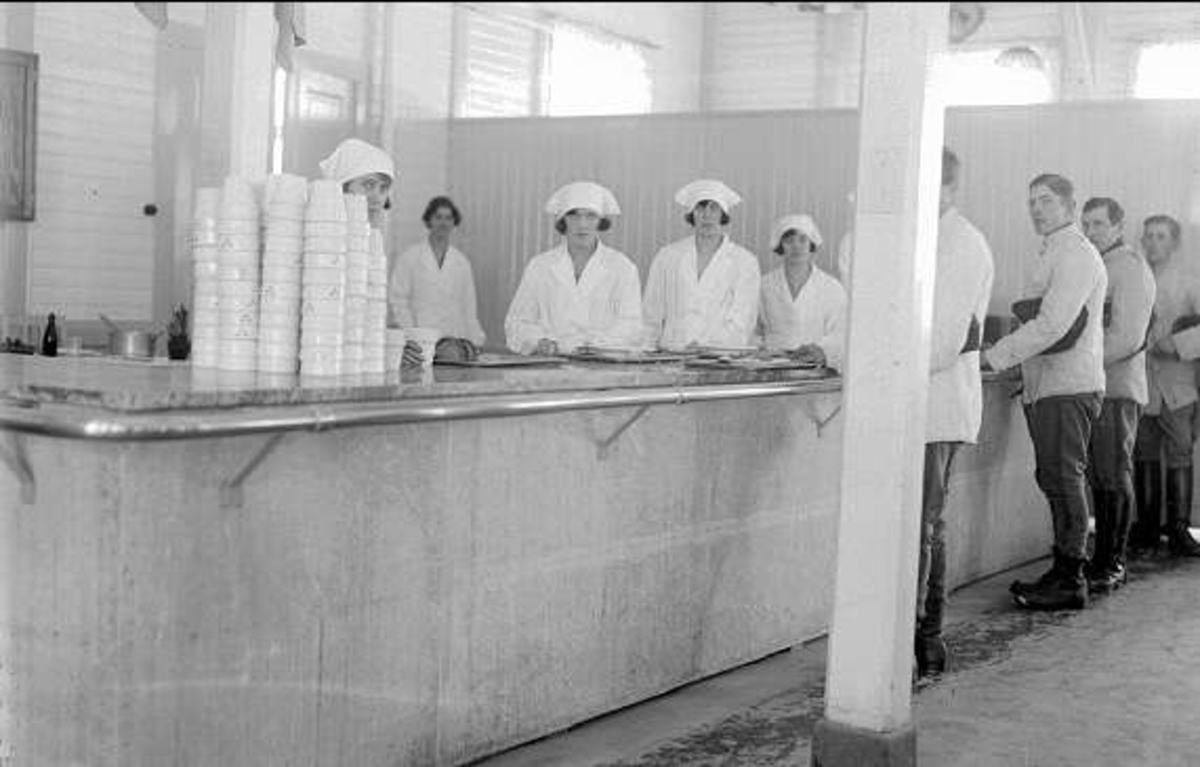 Klart för utspisning i K 3 matsal, kökspersonalen ("uvarna") vid backarna. Husmor, i bakgrunden övervakar det hela.