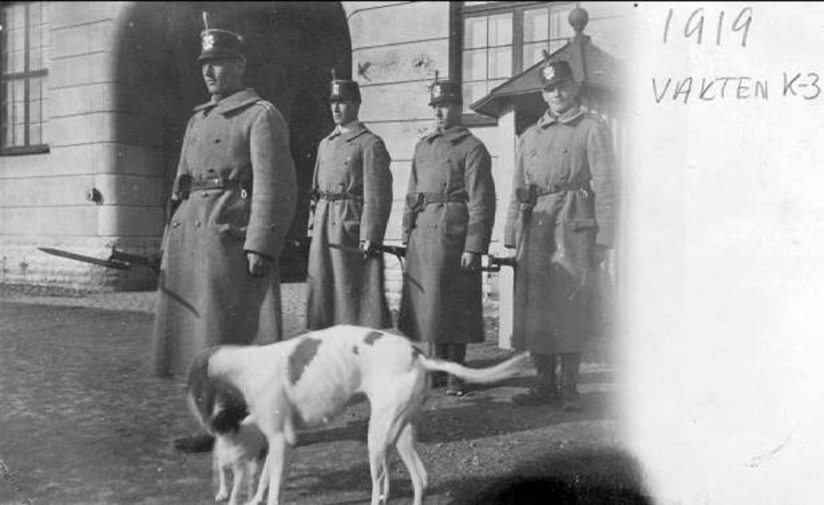 Vakten uppställd för visitation " När hunden syns ropa "I gevär" så hinner vakten ställa upp i tid till "Husse kommer"-antagligen sekundchef eller dagmajor. Lennart Engerby son till A G Andersson/Engerby i bakre raden längst till vänster.