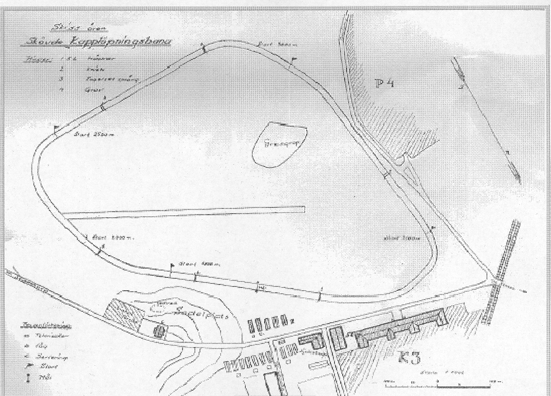 Skiss över Skövde kapplöpningsbana på fältet söder kasern. Banan som funnits tidigare återuppbyggdes i början av 1940-talet av personal ur handräckningsskvadron K 3 under ledning av skvadronschefen ryttmästare Erik "Buskas" Hultén. "Banarkitekt" var f.d. kapplöpningsryttare ryttm Gunnar "Putte" Schildt.