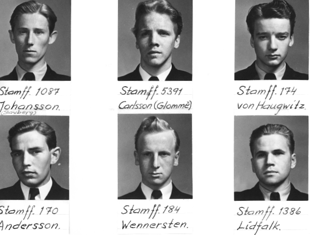 F6 Karlsborg 1949. Stamflygförare från vänster och uppifrån: 1087 Johansson, 5391 Carlsson, 174 von Haugwitz, 170 Andersson, 184 Wennersten, 1386 Lidfalk. Albumet är en del av en donation från Karl-Axel Hansson, Karlsborg. Förteckning över hela donationen finns i albumet samt som Word-dokument.