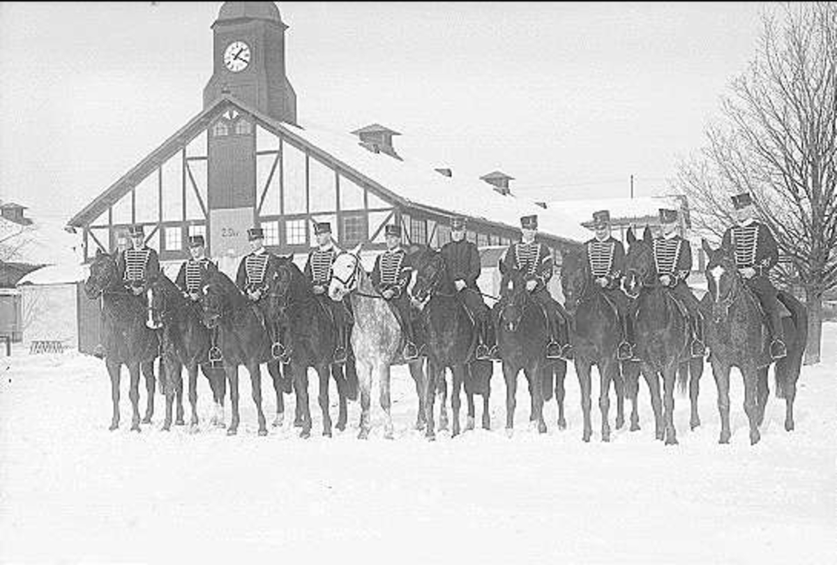 Titel: En skvadrons stamrekrytskola, skolchef underlöjtnant Melcher Wernstedt, uppställda på östra kaserngården snett framför Klockstallet. Femte från höger skolchefen, fjärde från höger skolchefens ställföreträdare (tvåstreckad furir).
