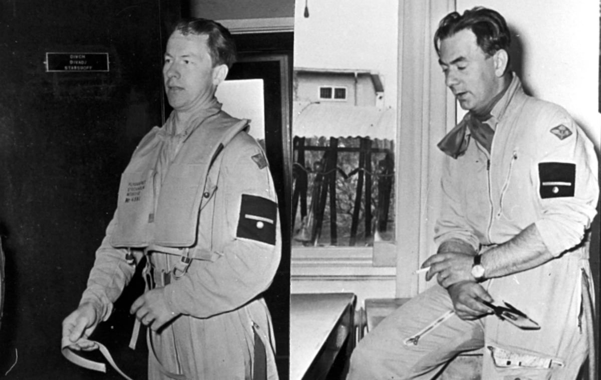 F6 Karlsborg 1957. Från vänster: Sergeant Neman, 1. flygnavigatör Sjöberg.