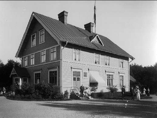 Kungliga posthuset i Karlsborg. Invigt 24/12 1904, revs 1991. Lägg märke till unionsflaggan. Förstoring 30 x 40 cm finns. Glasneg finns. Foto: A Sjöberg, år 1906.