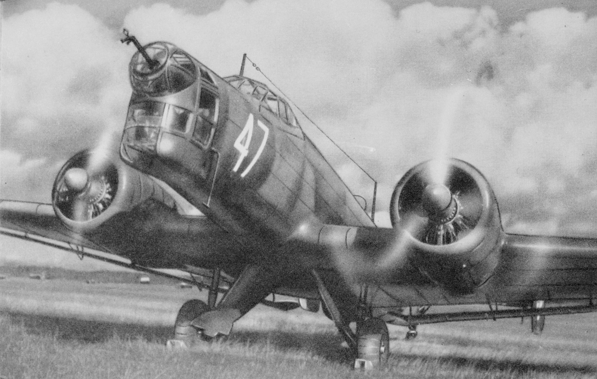 Närbild av bombflygplan B 3 märkt nummer 47, med snurrande propellrar. Reproduktion av kolorerat vykort.