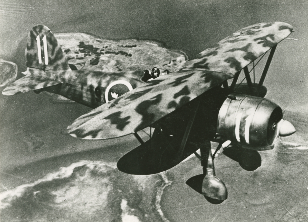 Kamouflagemålat flygplan J 11 märkt 11 tillhörande F 9 Göta flygflottilj i luften. Flygbild.