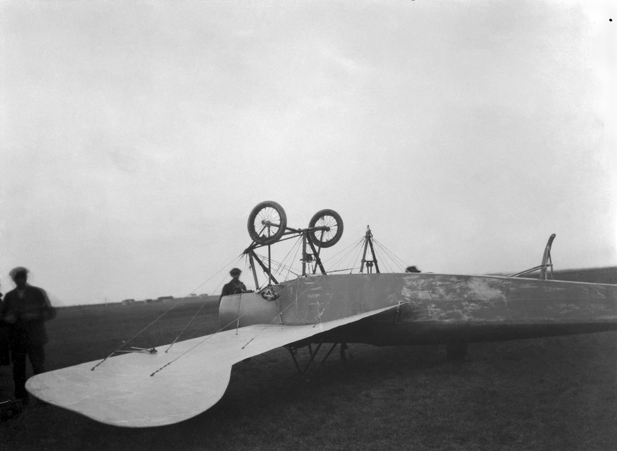 Flygplan av typ Lohner Schichtpreis-Eindecker Type 14 ligger upp- och ned på ett fält efter ett haveri. Två män vid flygplanet. Vy snett från sidan.