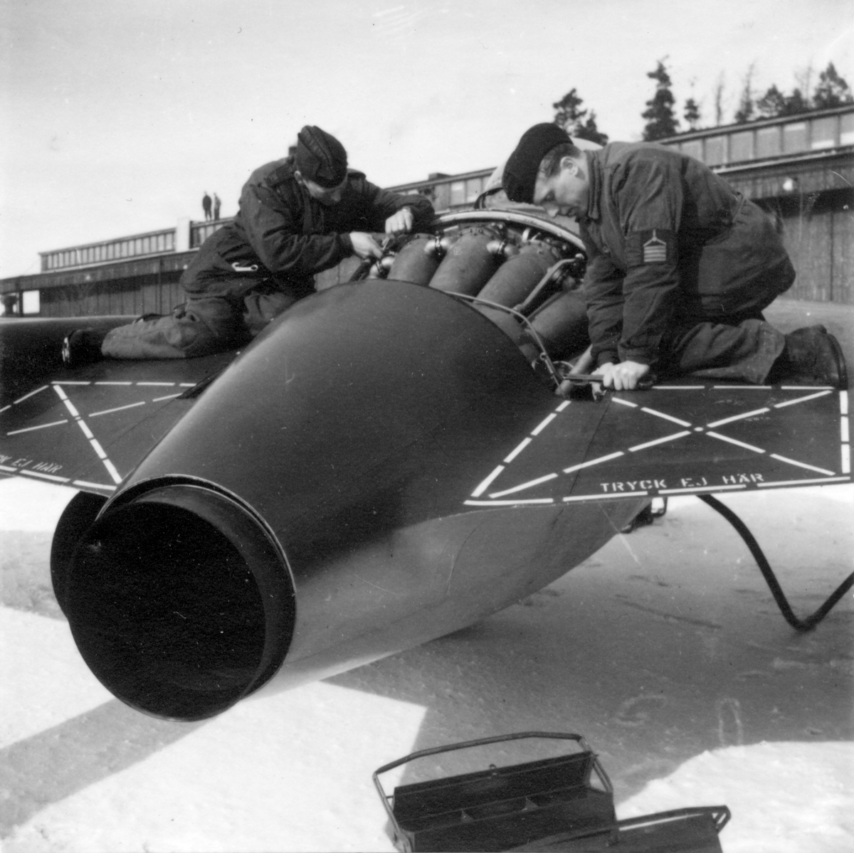 Service av flygplan J 28 framför hangar 82 på F 3 Malmen, vintertid.
