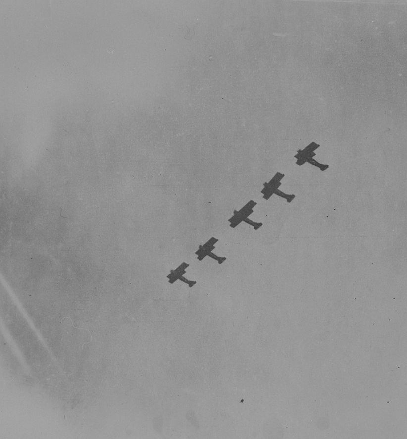 Fem stycken holländska flygplan Fokker D VII under uppvisning på Internationella luftfartsutställningen, ILUG, i Göteborg, 1923.