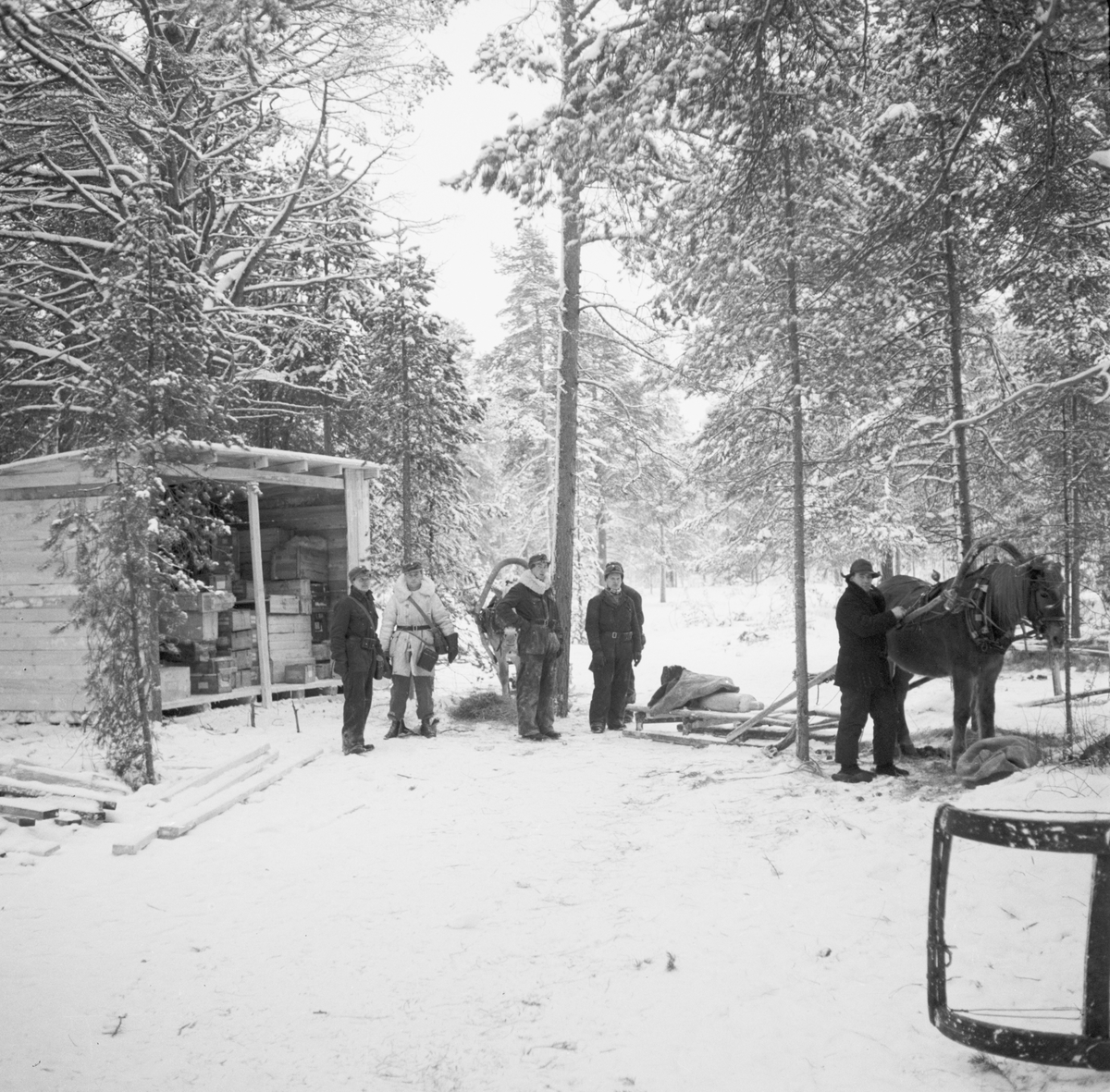 Ammunitionstransport från ammunitionsförråd vid Svenska frivilligkåren i Finland, F 19. Fem militärer vid häst och släde.