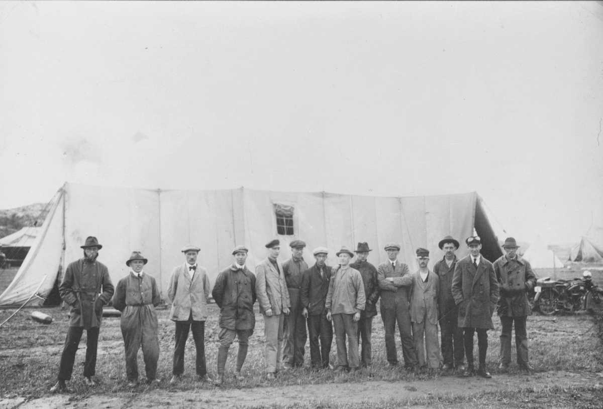 Grupporträtt. 14 män står framför tälthangarer för flygplan på ett fält, ca 1920-1930.