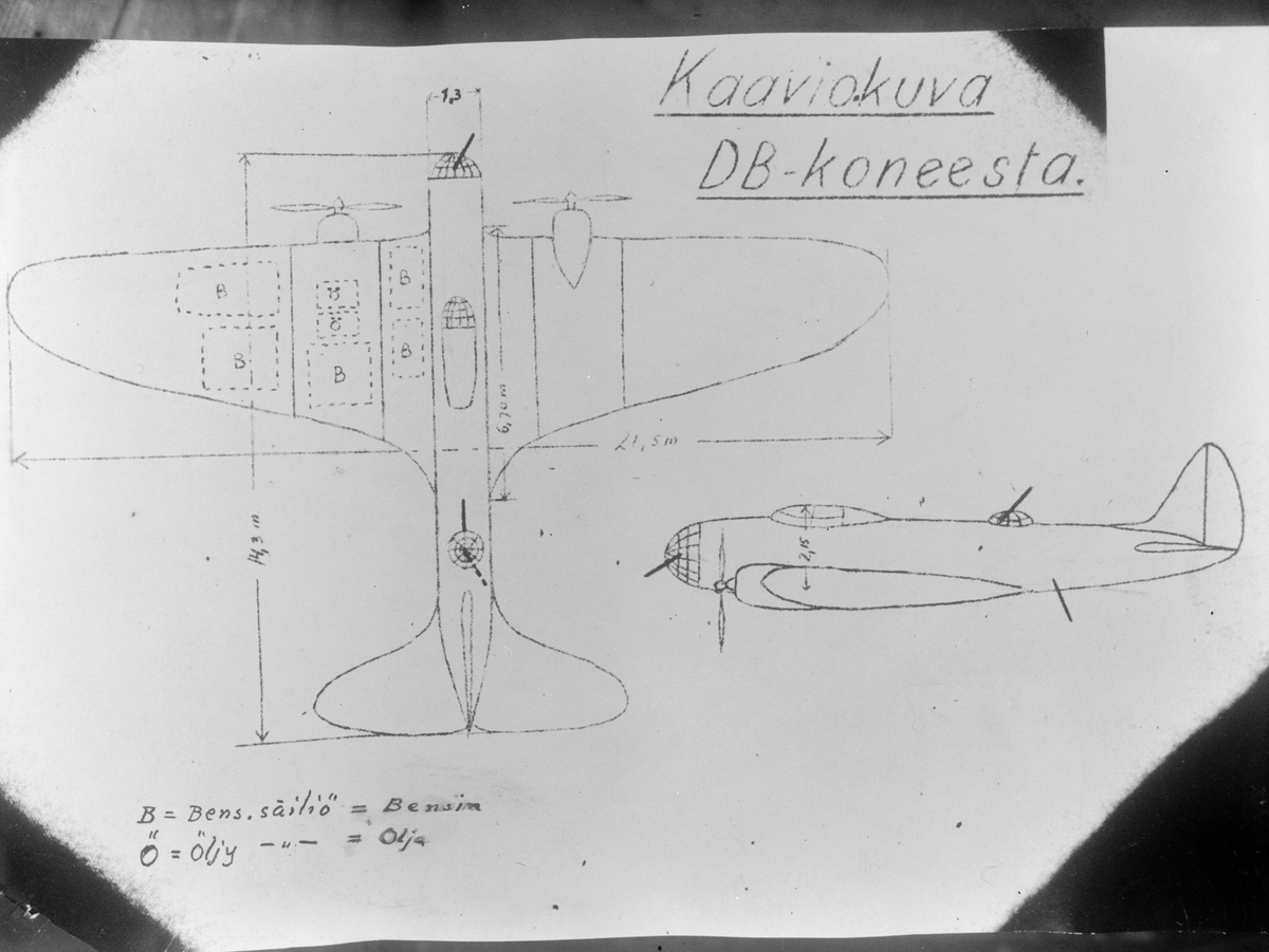 Avfotograferad skiss med finsk text av sovjetiskt flygplan Iljushin DB-3 med finsk text. Från F 19, Svenska frivilligkåren i Finland.
