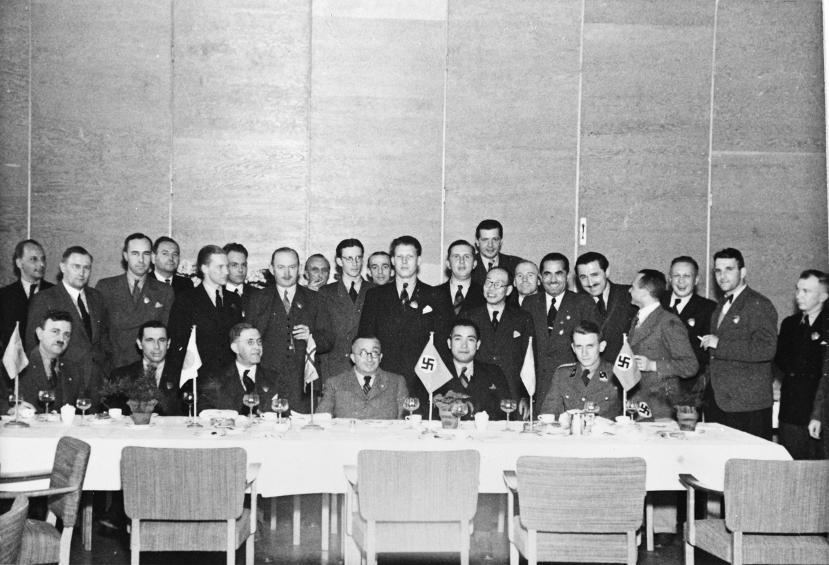 Grupporträtt, stor samling män vid ett bord med flaggorna för Sverige, Japan, Norge och Nazityskland. Troligen vid kontraktskrivning för flygplan Heinkel He 115A-2, år 1938.