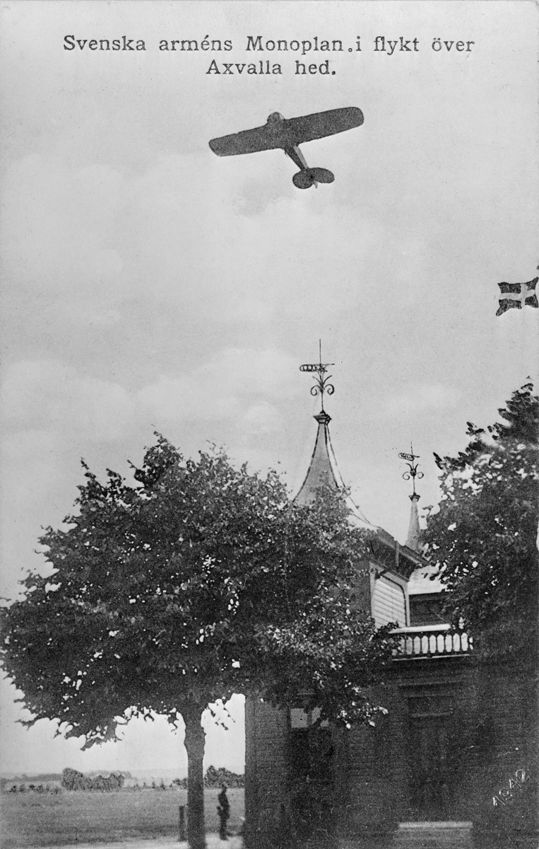 Vykort från 1912, med texten "Svenska arméns Monoplan i flykt över Axvalla hed."