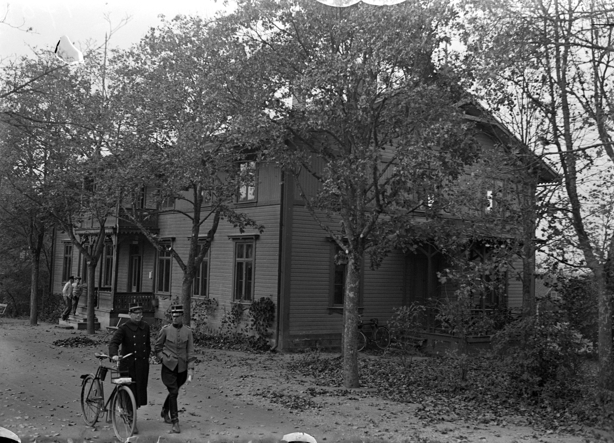 Musikkasern på regementsområdet på Malmen, omkring 1921-1924. Exteriör. Två militärer med en cykel i förgrunden.