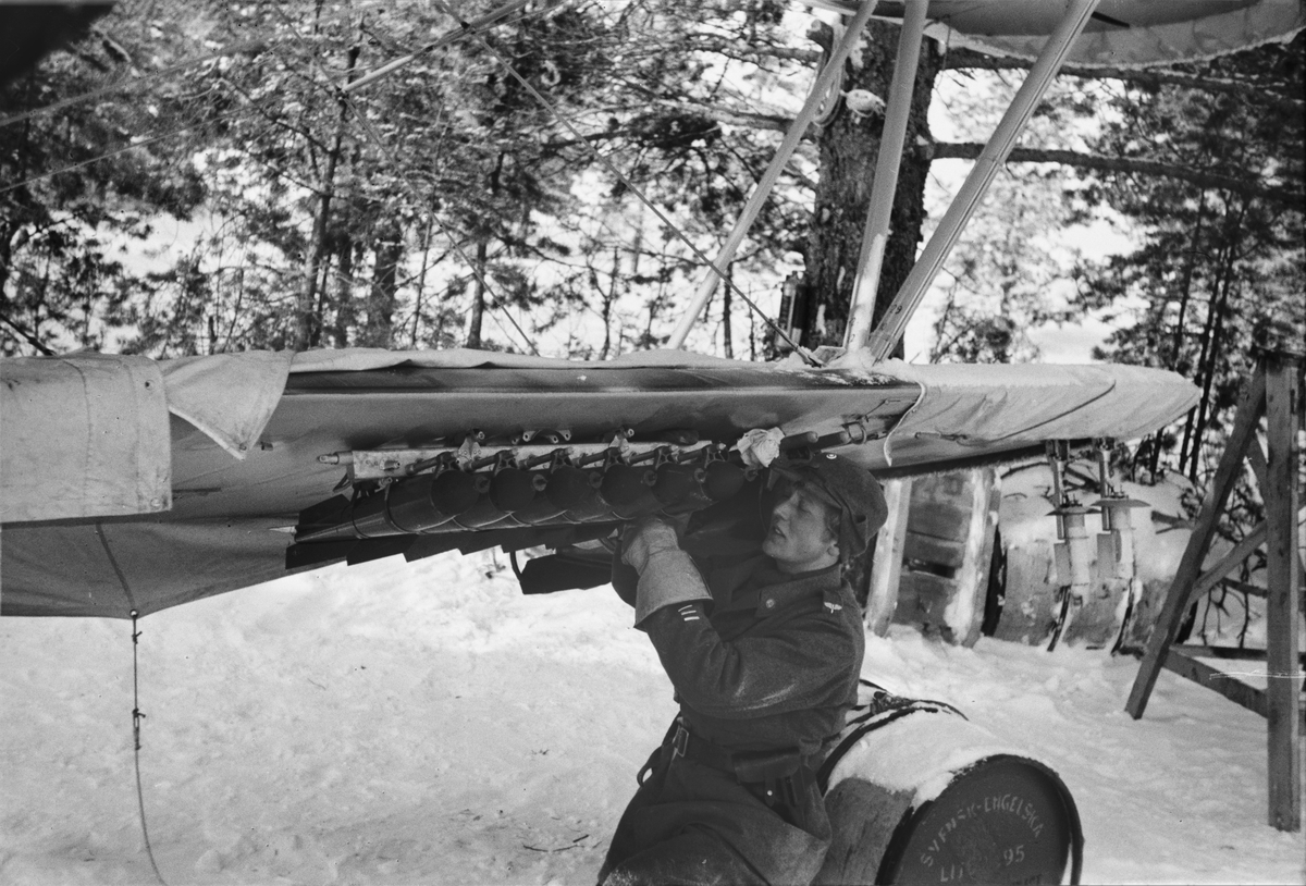 En flygtekniker laddar 12 kg:s bomber på flygplan B 4 Hawker Hart inför flygning den 18 februari 1940. Vid F 19, Svenska frivilligkåren i Finland.