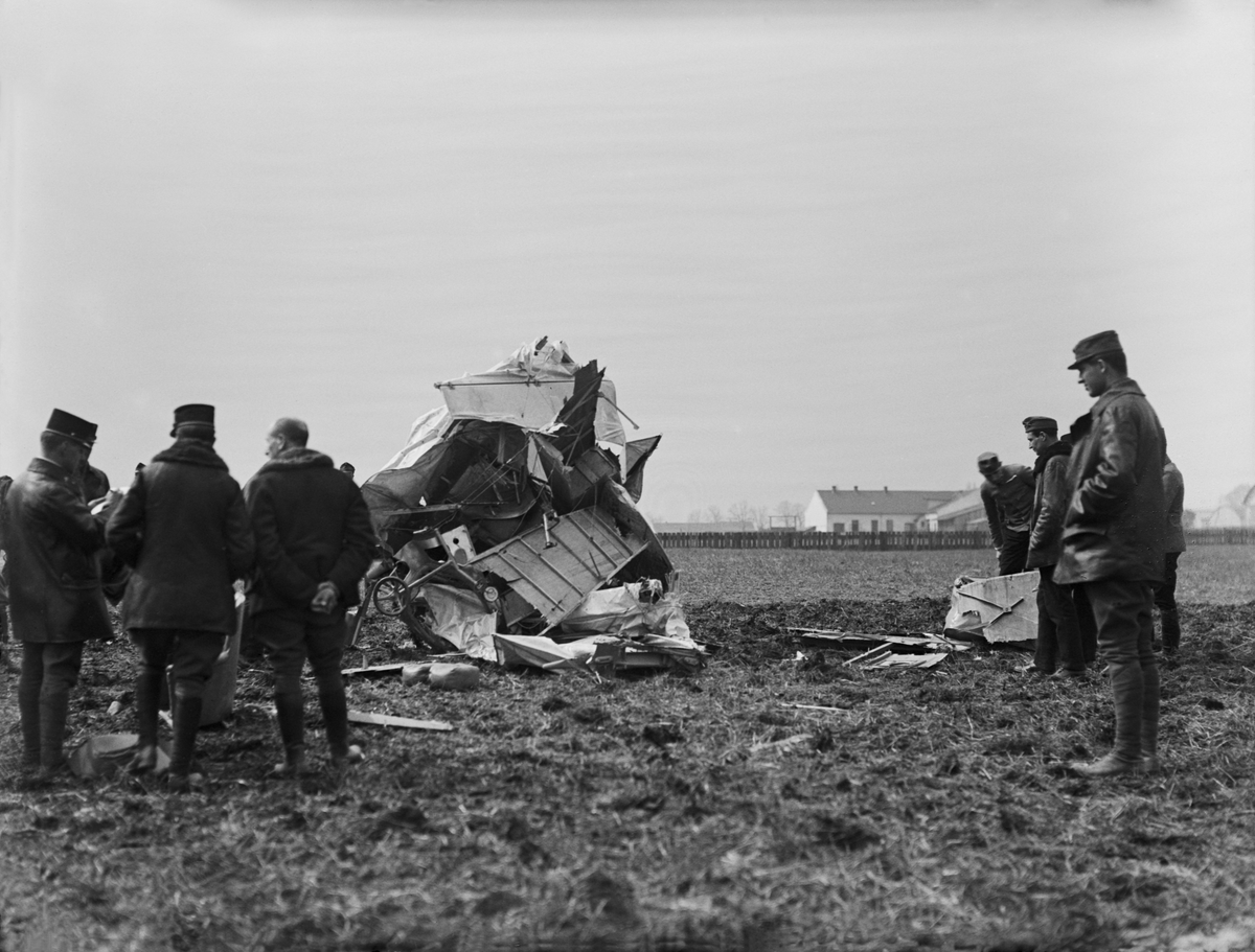 Havererat militärt flygplan Lohner nr 10.20 tillhörande Österrike-Ungern ligger på ett flygfält. Militärer i förgrunden.
