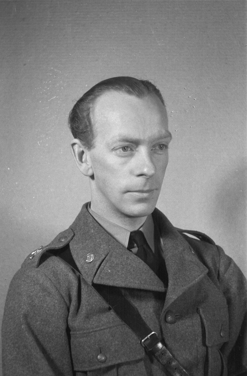 Porträttfoto av löjtnant Greger Falk (nummer 751), adjungerad signalofficer vid F 19, Svenska frivilligkåren i Finland under finska vinterkriget, 1940.