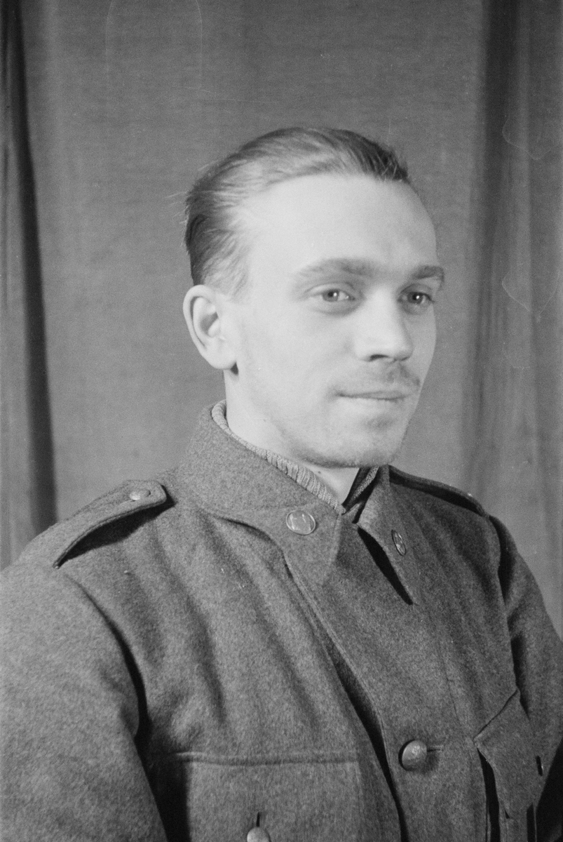 Porträttfoto av soldat Karl Åke Karlsson (nummer 822), chef tankningsavdelning vid F 19, Svenska frivilligkåren i Finland under finska vinterkriget, 1940.