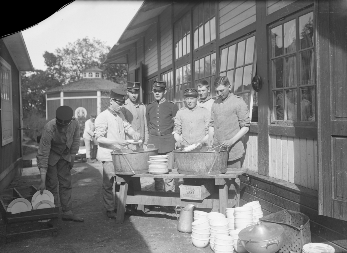 Grupporträtt. Armésoldater från I 4 regemete diskar på Malmens lägerområde. Andra mannen från vänster är Ernst Axfors. Totalt sju personer.