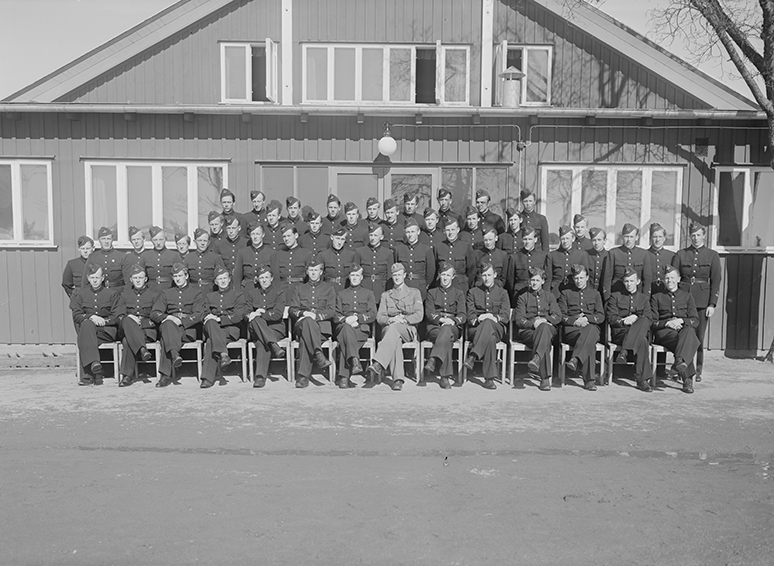 Elever och lärare vid volontärskolan på F 3 Östgöta flygflottilj, 1940-1941. Grupporträtt framför byggnad.