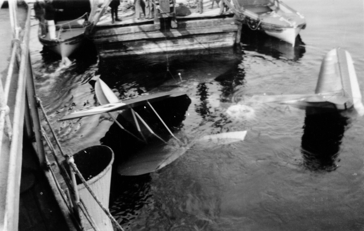 Bärgning av flygplan J 4 Heinkel HD 19 nr 2284 efter totalhaveri i Hårsfjärden den 15 augusti 1932. Flygplanet ligger i vattnet med endast vänster vinge och stjärt över ytan.