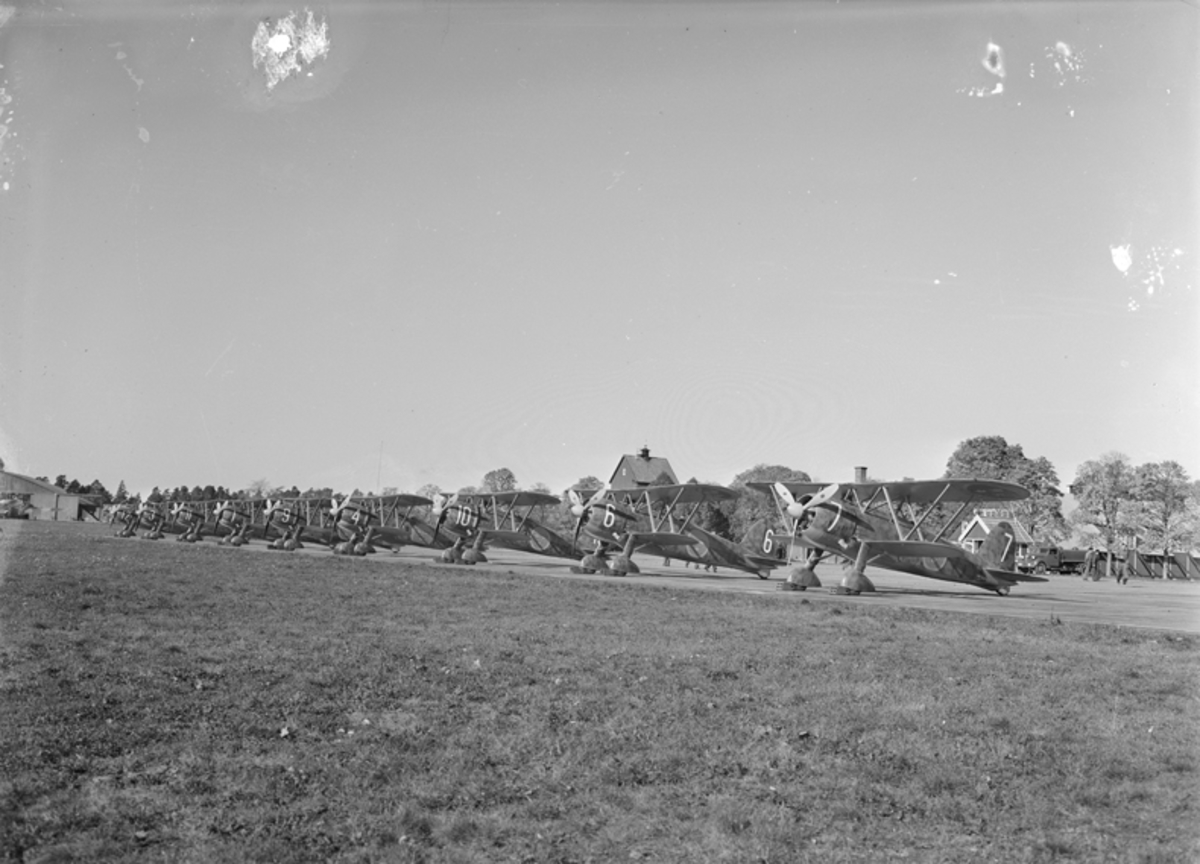 Nio stycken flygplan J 11 uppställda på linje på Malmen.