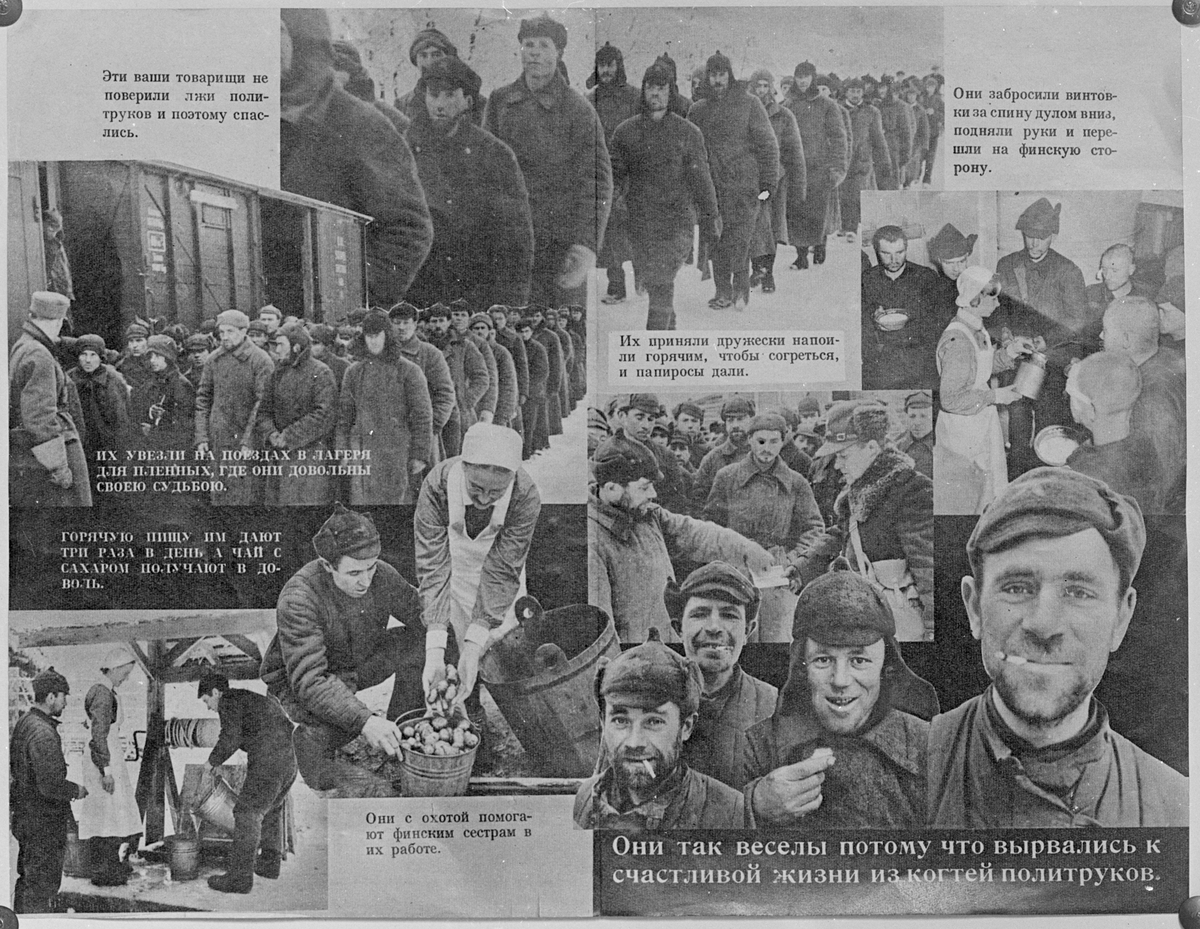 Reproduktion av flygblad: propaganda, från finska sidan till Röda Armé-soldater under finska vinterkriget 1939-1940. Kollage av foton och text.