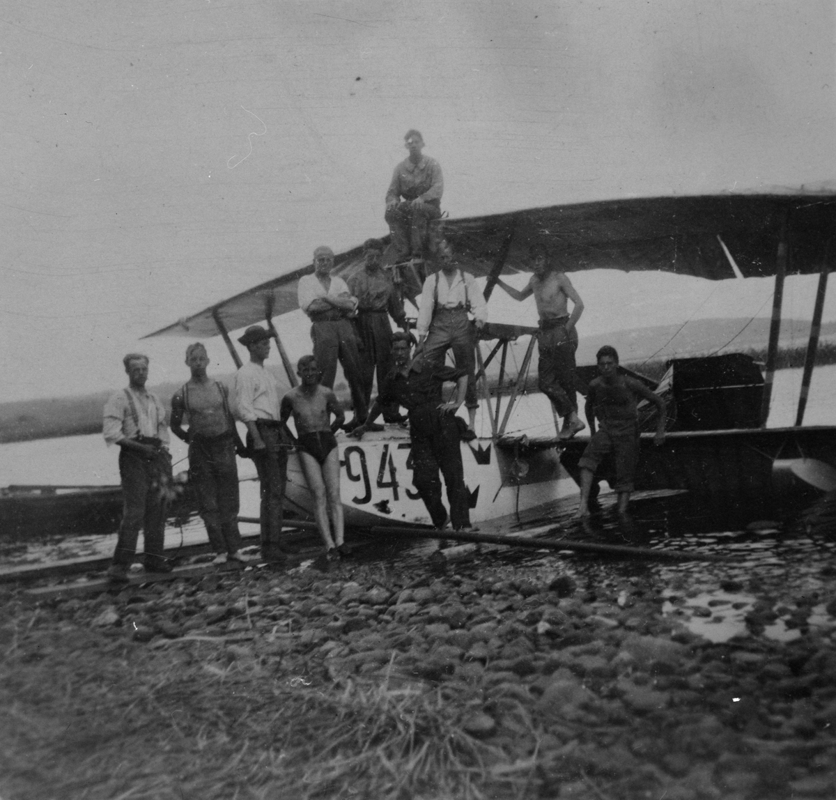 Grupporträtt. En samling militärer står vid sjöflygplan Macchi M.7 märkt nummer 943 på land vid sjön Roxen vid Bergs slussar.