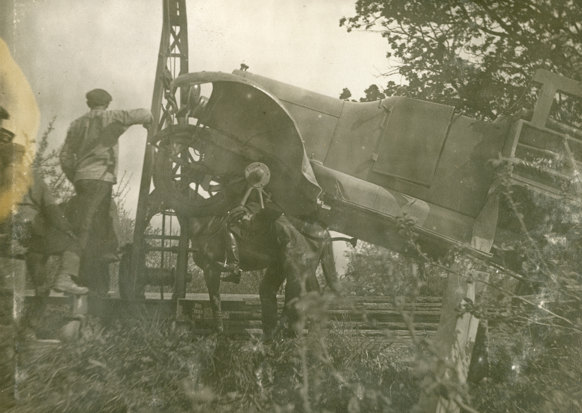 Bärgning av militär bil tillhörande Flygkompaniet på Malmen efter krasch i buskage, omkring 1919-1920.