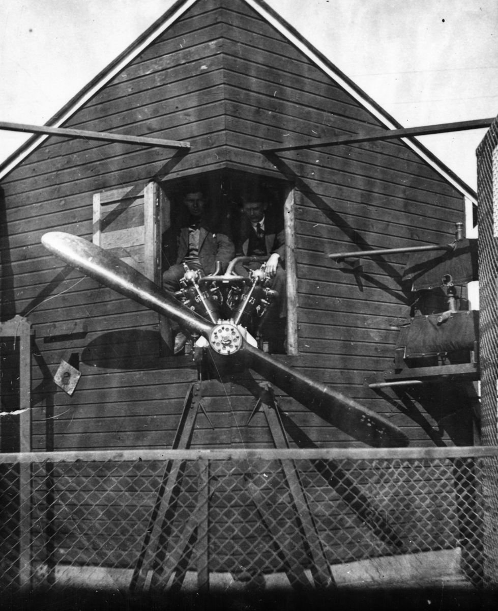Flygmotor placerad i motorprovbock på flygverkstäderna i Malmslätt. Två män sitter i huset bakom motorn.