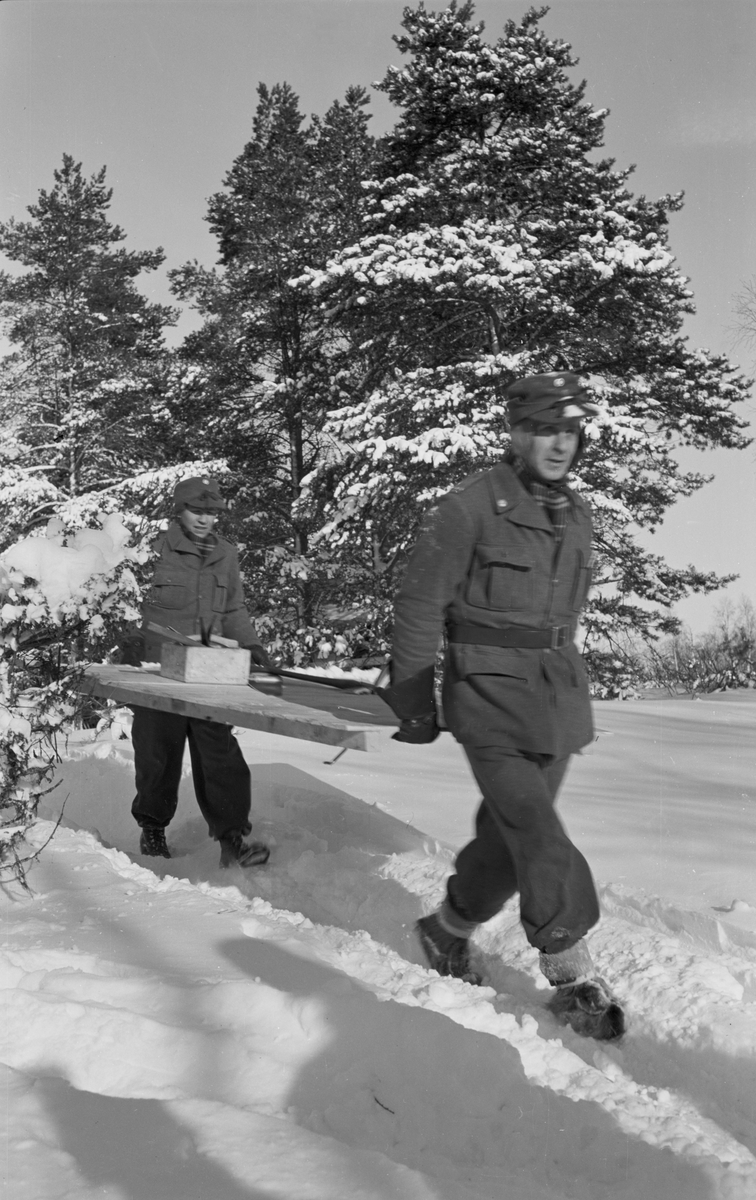 Transport av byggnadsmaterial vid värnbygge vid Svenska frivilligkåren i Finland, F 19. Två militärer bär ihopbyggd trädel i vinterlandskap.
