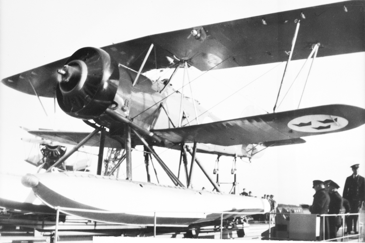 Närbild av spaningsflygplan S 9 i katapulten på flygplanskryssaren Gotland. Militärer vid flygplanet.