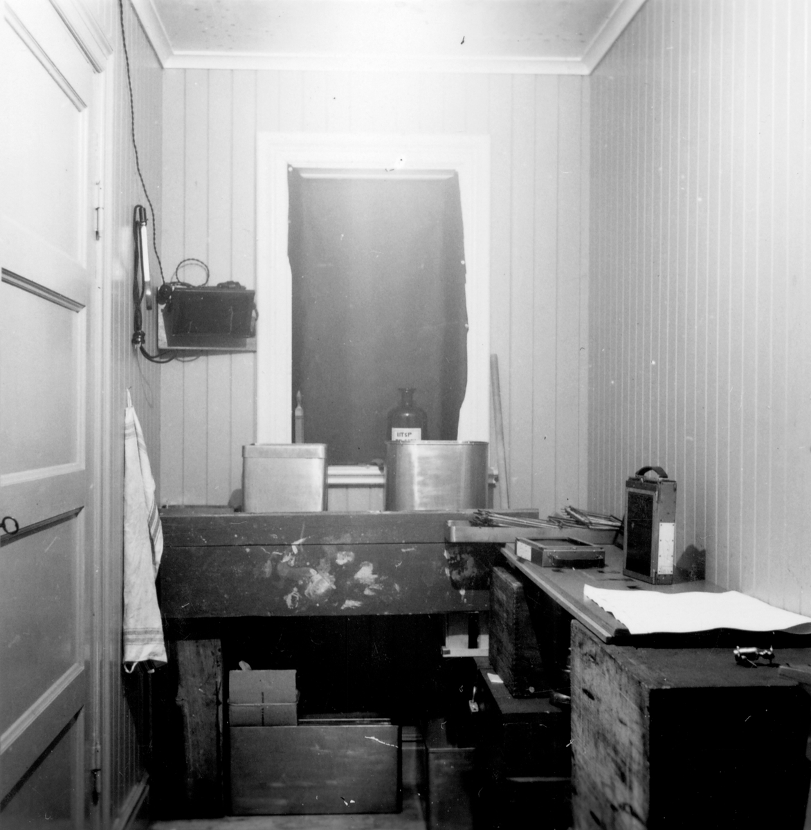 Arbetsbänk i provisoriskt framkallningsrum för fotografi för fotodetaljen på F 2 Roslagens flygflottilj under Delsbomanövern, 1938.