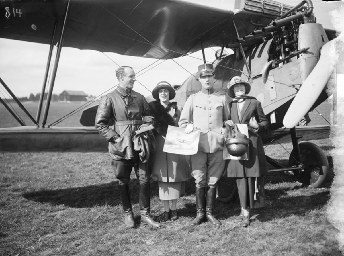 Fyra personer framför flygplan på Malmen. Till vänster en löjtnant och en kvinna och till höger i bild en kapten och en kvinna.